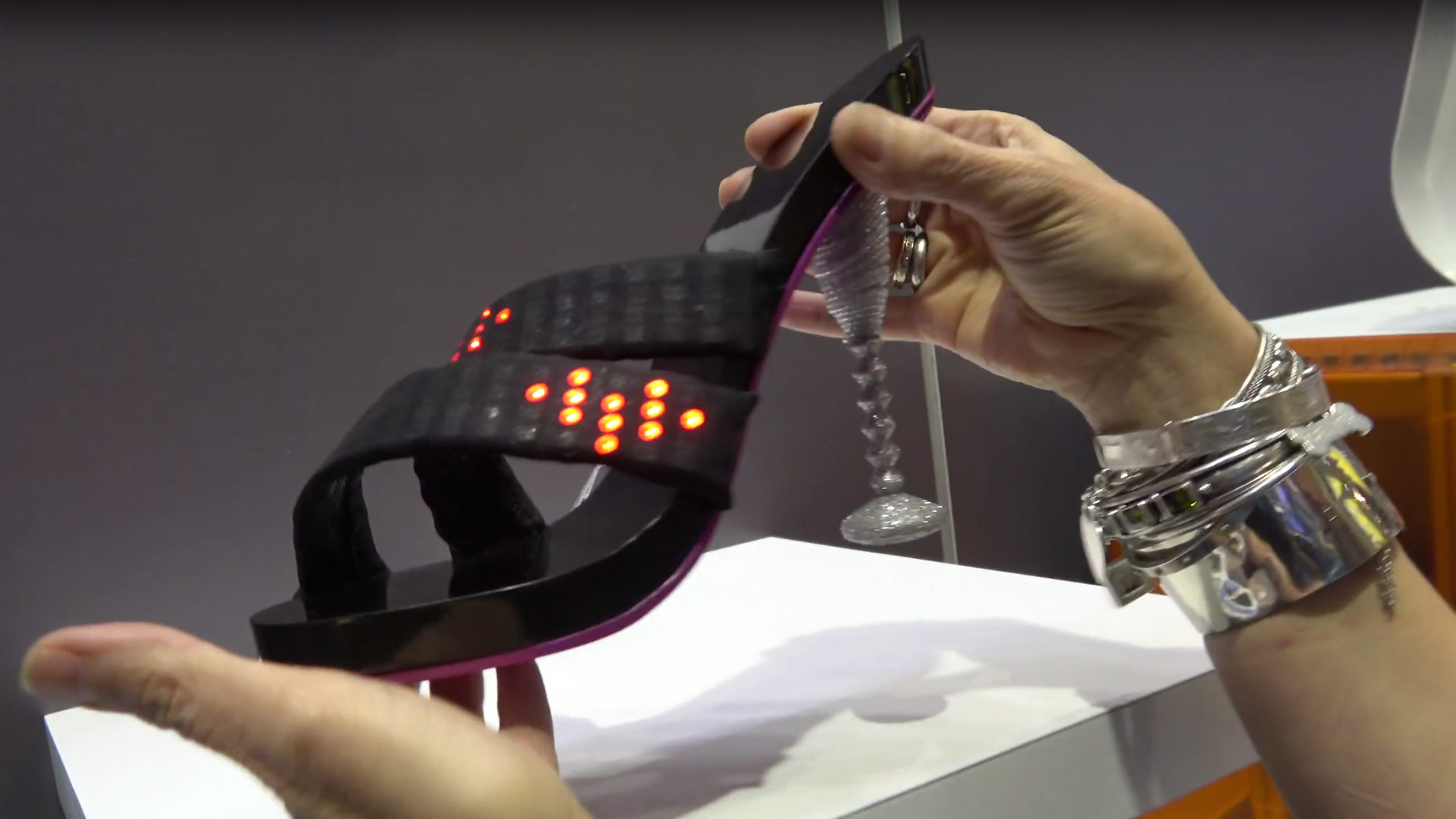 The sole, upper, and interchangeable heels were designed in Tinkercad on an ARM Powered Chromebook, printed using an ARM Powered 3D printer, and then decorated with custom car paint and Swarovski crystals. The circuitry and the LED designs were both done on Raspberry Pi 3. The shoe is powered by an ARM Cortex-M0+ that sits on an Arduino MKR1000 board that is hidden in the shoe’s upper.